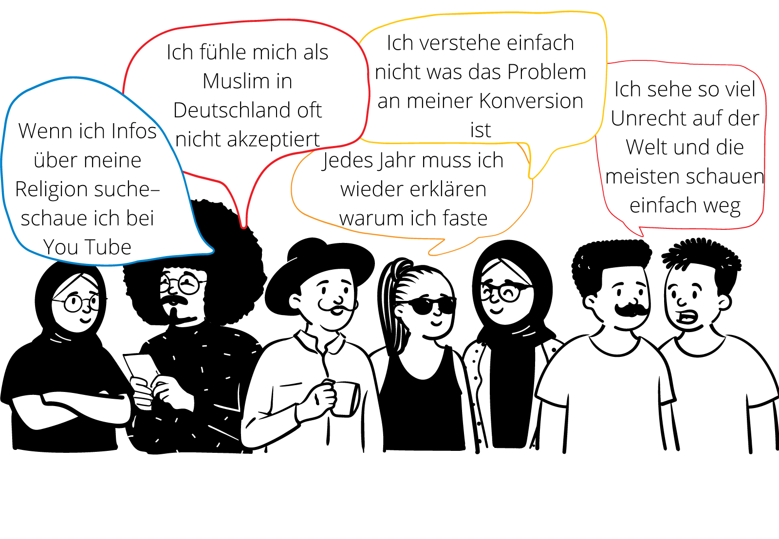 Begleitung meint daher für uns sowohl die Auseinandersetzung und den Dialog über Religion, Spiritualität und Sinnstiftung, als auch die Hilfe zur Bewältigung von Entwicklungsaufgaben. Gleichzeitig bieten wir geschützte Räume, um über Ausgrenzungs- und Rassismuserfahrungen zu sprechen und einen produktiven Umgang damit zu finden. Jugendliche sind im Begleitungsprozess keine Hilfsempfänger*innen, sondern eigenständige Akteur*innen und Expert*innen ihrer Lebenswelt. Unser Angebot basiert auf der Anerkennung dieser Realitäten.